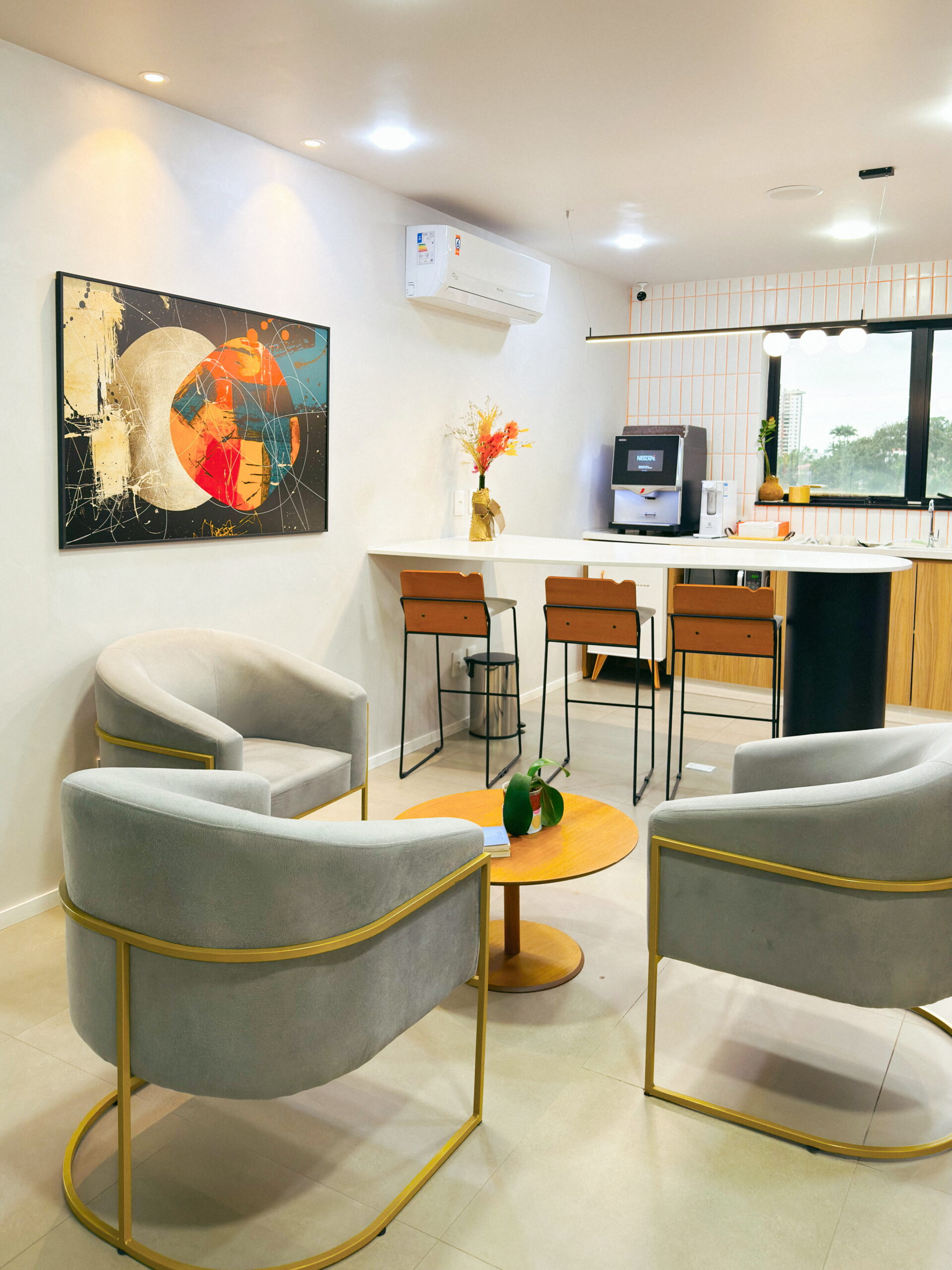 Endereço fiscal, impressões, recepcionista e espaço de convivência com máquina de café profissional e networking.